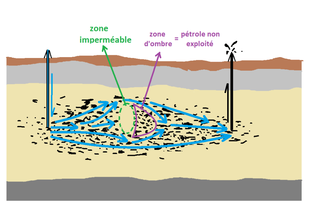 Donc, un réservoir c’est comme une éponge remplie de pétrole, dans laquelle on injecte de l’eau à un bout pour faire sortir le pétrole par l’autre. Mais comme tout objet naturel, la porosité des roches qui composent cette « éponge » n’est pas forcément homogène, et il est possible que certaines zones imperméables agissent comme des sortes d’obstacles vis à vis des déplacements de fluides dans la nappe. Ceci peut aboutir à la formation de « zones d’ombre« , où le pétrole n’est pas chassé par l’eau. Un peu comme une pierre placée au milieu d’une rivière protège du courant la zone juste derrière elle.