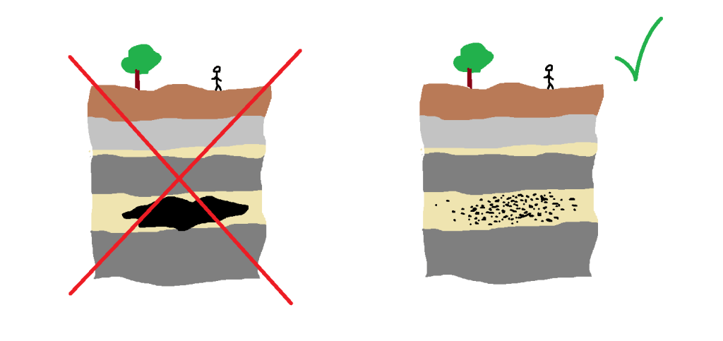 Quand on parle de nappe en profondeur (qu’il s’agisse d’une nappe pétrolière ou d’une nappe phréatique), la plupart des gens imaginent une sorte de vaste lac souterrain. Et pourtant cette première image est fausse ! Une nappe pétrolière tient moins du lac et plus de l’éponge. En effet, la plupart des roches qui composent un réservoir pétrolier sont faites de sable compacté et solidifié. De ce fait, elles possèdent une certaine porosité entre les grains, dans laquelle peut s’infiltrer un fluide: par exemple du pétrole.